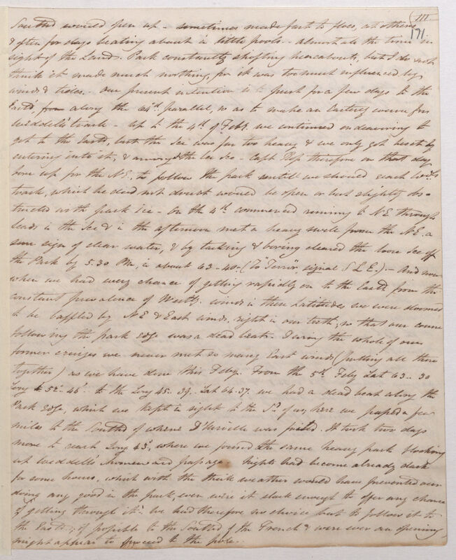 Lest there should not be time after our (hoped for) arrival at the Cape, to send a good letter by the first ship that will sale from thence, I shall put this account of this cruise in a state of partial forwardness, beginning it only 2 days after bearing up for the third time from these dreary regions of the South. You will be sorry to hear that we have not attained the high Latitude we so wished, & have been entirely foiled in Weddell's track, by firm packs; which position we did not reach from foul winds & other causes until it was far too late to take the pack with the ships. Our furthest south was 71-30 Long 15 W. on 5th of March when we were brought up by heavy ice, a few miles to the south[war]d of any previous navigator (ourselves excepted) but Weddell. Though much disappointed it is some consolation to have run from Long 60º to 10º, further south than the French reached during their attempt to follow in the poor sealers steps.
