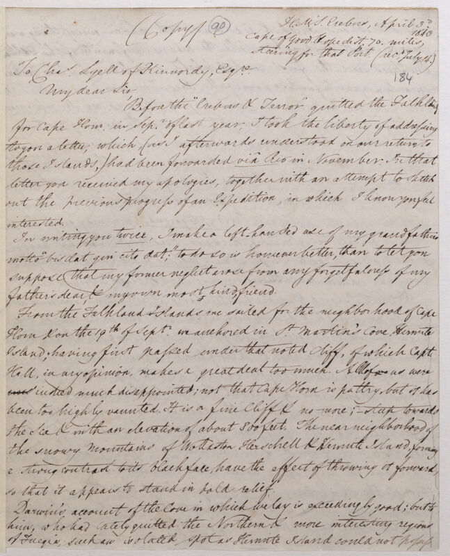 Before the "Erebus & Terror" quitted the Falklands for Cape Horn, in Sep[tembe]r. of last year, I took the liberty of addressing to you a letter, which, (as I afterwards understood on our return to those Islands,) had been forwarded via Rio in November. In that letter you received my apologies, together with an attempt to sketch out the previous progress of an Expedition, in which I know you feel interested.