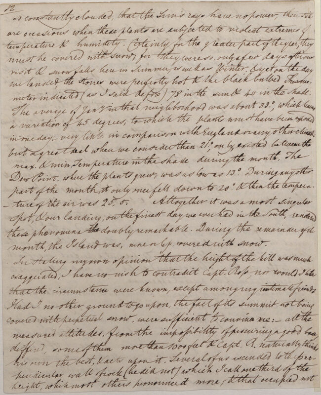 so constantly clouded, that the Sun's rays have no power, there still are occasions when these plants are subjected to violent extremes of temperature & humidity. Certainly for the greater part of the year, they must be covered with snow; for they were so, only a few days after our visit & snow falls here in Summer, as well as Winter: & yet on the day we landed, the stones were perfectly hot & the black bulbed Thermometer indicated (as I said before) 78 in the sun & 40 in the shade. The average of Jan[uar]y in that neighborhood[sic] was about 33(, which leaves a variation of 45 degrees, to which the plants must have been exposed in one day; -- very little in comparison with England or any other climate, but a great deal when we consider than[sic] 21(, only, existed between the max[imum]. & min[imum]. Temperature in the shade during the month. The Dew Point where the plants grew, was as low as 13(. During any other part of the month, it only once fell down to 20( & then the temperature of the air was 25.5. Altogether it was a most singular spot, & our landing, on the finest day we ever had in the South, rendered these phenomena the doubly remarkable. During the remainder of the month, the Island was, more or less, covered with snow.