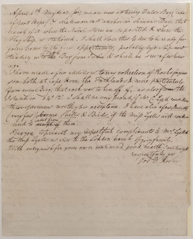 I have made a few additions to my collection of Rocks for your son, both at Cape Horn, the Falklands & more particularly from every Berg, that rock was taken off of, -- as also from the Island in 64(.12'. I shall be very proud, if Mr C. Lyell considers these specimens worthy his acceptance. I have also a few Insects (very few), & some Shells & Birds, if the Miss Lyells will condescend to accept of select from them.