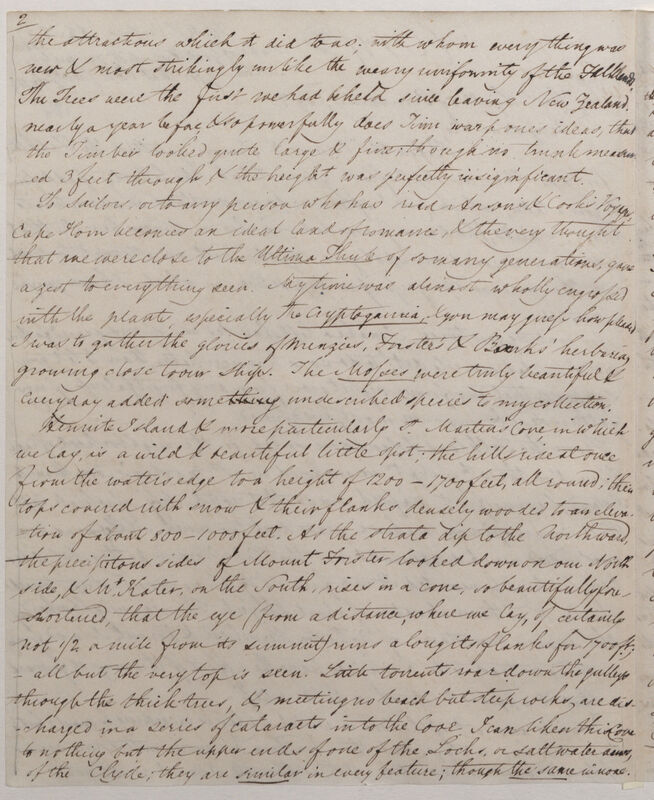 To Sailors, or to any person who has read[?] Anson's & Cook's Voyages, Cape Horn becomes an ideal land of romance, & the very thought that we were close to the Ultima Thule of so many generations, gave a zest to everything seen. My time was almost wholly engrossed with the plants, especially the Cryptogamia, & you may guess how pleased I was to gather the glories of Menzies', Forster's & Banks' herbaria, growing close to our Ships. The Mosses were truly beautiful & everyday added something undescribed species to my collection.
