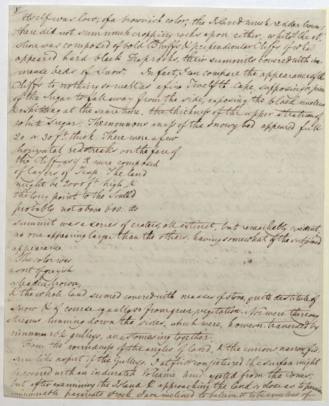 *3 itself was low, of a brownish color[sic], the Island much redder brown; there did not seem much cropping rocks upon either, whilst the N. shore was composed of bold Bluffs & perpendicular Cliffs of what appeared hard black Trap rocks, their summits covered with immense beds of Snow. In fact, I can compare the appearance of the Cliffs to nothing so well as a fine Twelfth Cake, supposing a piece of the Sugar to fall away from the side, exposing the black nucleus & exhibiting at the same time, the thickness of the upper striation of white sugar. The enormous mass of the snowy bed appeared full 20 or 30 f[ee]t thick. There were a few horizontal red streaks on the face of the Cliff, as if it were composed of layers of Trap. The land might be 2000 f[ee]t high, & the long point to the South[war]d probably not above 600: its summit was a series of craters, all extinct, but remarkably evident, no one appearing larger than the others, having somewhat of the subsumed appearance. The color[sic] was a sort of greyish or leaden--brown, & the whole land seemed covered with masses of stone, quite destitute of snow & of course equally so from green vegetation. Nor were there any Streams running down the sides, which were, however, traversed by innumerable gulleys, anastomosing together.