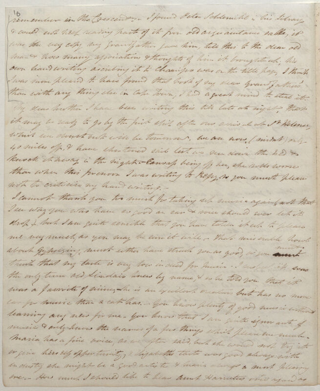 I cannot thank you too much for taking up music again (not that I see why you who have so good an ear & voice should ever let it drop) but I am quite sensible that you have taken it up to please me very much, as you may be sure it will. -- That miserable howl about Gypseying[?] must either have struck you as good, or you [1 word crossed out, illeg.] must think that my taste is very low indeed for music. I suspect it was the only tune old Sinclair knew by name, & so he told you that it was a favourite of mine, -- he is an excellent creature but has no more ear for music than a cat has. -- You know plenty of good music without learning any new for me. You know that I am quite ignorant of music & only know the names of a few things which please me much. Maria has a fine voice, as we often said, but she would not try it or give herself opportunity; & Elizabeth's taste was good always: with industry she might be a good artiste & Maria always a most pleasing one. -- How much I should like to hear Aunt Harriettes voice again as