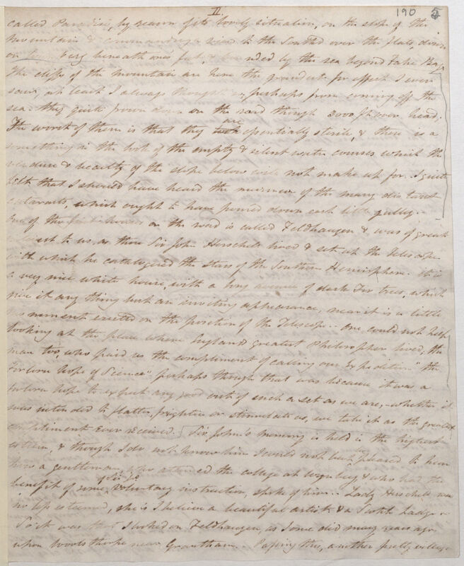 called Paradise, by reason of its lovely situation, on the slope of the Mountain & commanding a view to the South[war]d over the flats, down on Wynberg beneath one's feet, & bounded by the sea beyond Table Bay. The cliffs of the Mountain are here the grandest for effect I ever saw, at least I always thought so, perhaps from coming off the sea. they quite frown down on the road though 3000 ft over head; The worst of them is that they look are essentially sterile, & there is a something in the look of the empty & silent water courses which the verdure & beauty of the slope below will not make up for. I quite felt that I should have heard the murmur of the many distant cataracts, which ought to have poured down each little gully. One of the first houses on the road is called Feldhauzen & was of great interest to us, as there Sir John Herschell lived & set up the Telescope with which he catalogued the stars of the Southern Hemisphere. it is a very nice white house, with a long avenue of dark Fir trees, which give it any thing but an inviting appearance, near it is a little monument erected on the position of the Telescope. One could not help looking at the place where England's greatest Philosopher lived; the man too, who paid us the compliment of calling our Expedition "the forlorn hope of Science" perhaps though that was because it was a forlorn hope to expect any good out of such a set as we are, -- whether it was intended to flatter, frighten or stimulate us, we take it as the greatest compliment ever received. Sir John's memory is held in the highest esteem, & though I do not know him I could not but be pleased to hear how a gentleman who attended the college at Wynberg, & who had the benefit of some of Sir Js voluntary instruction, spoke of him. Lady Herschell was no less esteemed, she is I believe a beautiful artist & a Scotch Lady. -- So it was that I looked on Feldhauzen, as I once did many years ago, upon Woolsthorpe near Grantham. Passing this, another pretty village