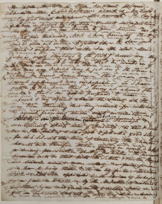 Campbell truckle to these pestilent fellows. I have written to Lord Dalhousie about it, but do not expect much redress on this account. The Rajah of Sikim[sic] is pressed by Bootan, & wants our assistance this by treaty we are bound to give however ill the Rajah has behaved, but I hear privately that Lord D[alhousie]. does not intend to grant it. He does not think I suppose that either I or the Pol[tical]. Resid[ent]. (who is sadly snubbed by the govt.) know any--thing of this & when Ld D[alhousie]. told me that he would see if there was any possible way to get me to the snow in Sikim[sic], he must have known that under our present relations it was impossible -- So I have written to tell him that I know all about the matter & that I am quite prepared to have a refusal to my request about the snow, at the same time thanking him very much for entertaining my request favourably under such circumstances. Ld D. is no politician though Lord Dalhousie is a thorough & uncommonly sharp man of business: is sent out [to] make the best of a bad job & get up a good story for the E[ast]. I[ndia] C[ompany]. at the time of renewing he charter, he will not therefore draw a sword or waste a shot under any provocation short of open hostilities. The probable conclusion will be that both the Sikim[sic] & Bootan Rajahs will become more & more insolent & a future governor will have to bring them to terms by force. The Sikim[sic] Rajah is a Thibetan appointed by the Lamas of Lahassa, driven from his territories by the Nepalese & restored to his throne by us who guaranteed to retain him on it. Had we followed this up by insisting on his allowing