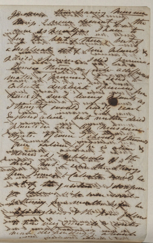 I made no stay at Burdwan because Williams operations were over & the pits filled up. I took Benares on my downward passage to the plain where I struck off N[orth]. to the mts. I do not know when I shall see Calcutta again I am so pleased with the Himalayah I shall go hence to Assam via Goalpara Gowahatty where Jenkins is -- he writes me that I may reach the Him[alaya] snow via Bootan; but this I know is impossible & I cannot conceive how he comes to say so. I have written to him again: he has a large collection for you. From Gowahatty I hope to go right up to Sadiya at the foot of the Mishmee [Mishmi] hills a little beyond the Tea plantations & then if safe S[outh]. E[ast]. crossing a snowy ridge to Ava no great distance --N[orth]. E[ast]. it is impossible to go from the tribes being all at war there. Except there be some political