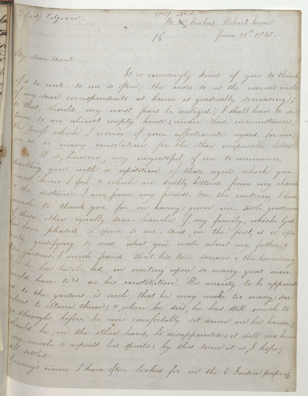 It is, however, very ungrateful of one to commence troubling you with a repetition of those regrets, which you must know I feel, & which are doubly bittered from any absence & the distance I am from my friends. On the contrary, I have much to thank you for in having given me such good news of those other equally dear branches of my family, which God has been pleased to spare to me. And, in the first, it is especially gratifying to read what you write about my father & Kew gardens. I much feared that his late sorrows & the harassing life he has lately led, in waiting upon so many great men would have told on his constitution. His anxiety to be appointed to the gardens is such, that he may make too many sacrifices to obtain them; &, when he does, he has still much to go through before he can comfortably sit down in his house: should he, on the other hand, be disappointed, it will vex him very much & depress his spirits: by this time it is, I hope, all settled.