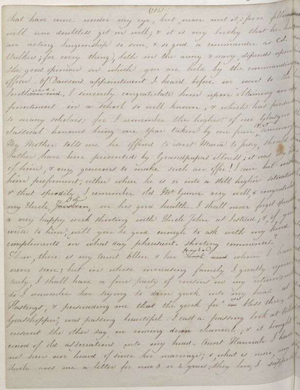 that have come under my eye, but never met it: poor fellow will now doubtless get on well; & it is very lucky that he has an acting Surgeonship so soon, & so good a commander as Col[onel] Wilkins; for every thing, both in the army & navy, depends upon the good opinion in which you are held by the commanding officer -- of Dawson's appointment I heard before we went to the Southern end ward. I sincerely congratulate him upon obtaining an appointment in a school so well known, & which has produced so many scholars; for I remember the highest of our Glasgow classical honours being one Year taken by one from that seminary. My mother tells me he offered to escort Maria to Jersey, should my father have been prevented by Grandpapa's illness: it was very kind of him, & very generous to make such an offer! I can but wish him preferment, either where he is or into a still higher situation & that speedily. I remember old Mr Gunn very well, & congratulate my Uncle, Jacobson John, on his good health. I shall never forget spending a very happy week shooting with Uncle John at Irstead; &, if you write to him, will you be good enough to ask with my kind compliments on what day pheasant shooting commences?