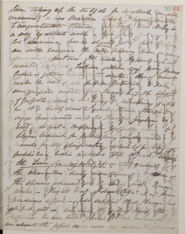 I am taking up the cudgels for Wallich on all occasions; so has Madden whom I have written to congratulate thereon. His Tent[amen]. Flor[ae]. Nep[alensis]. is a very excellent work. I am glad you saw Col[onel] Lawrence, has he shaved yet? He & Hodgson are bitter enemies, the latter former having been unceremoniously put over H[odgson]'s head in Nepaul [Nepal]. L[awrence]. is wanted sadly in Lahore where my poor friend Curries is getting into hot water. Here I must make the best of all Indian Botanists, & I am sure you will accede that I have said the best of Griffiths work & McLellands rendering of it for it is vilely done I must think though to say so here would be to be thought jealous &c. But what a coxcomb Griffith was to blame Wallich for publishing undescribed names for self glorification; whilst he himself publishes in India a Musc. Itin Assam: when after the Linn[ean]. Soc[iety]. rejected it on the grounds of the characters being insufficient & some of the species already described in well known books -- Voights Hort[us]. Suburb[anus]. Calc[uttensis]. is a poor ponderous affair. -- I do suppose that Brown has all but cut us; Ever since the getting back of the Rafflesias he has held a grudge & his conduct to me about the fossil cones was so mean & jealous