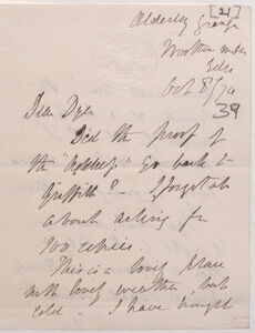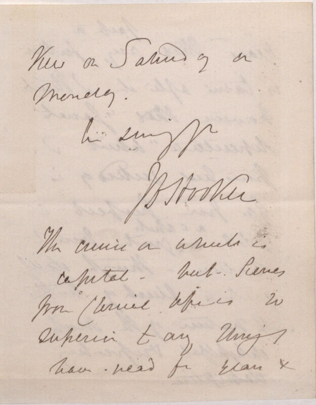 JDH asks Thiselton-Dyer if the proof of his 'address' has been sent to the publisher, Griffith. JDH describes his present location, Alderley Grange in Wotton under Edge, as 'a lovely place'. Whilst there he is working on the Royal Society address & the 'Primer' [refers to the series of 'Science Primer' books published by Macmillan, for which Hooker wrote the volume entitled BOTANY (1876)]. The following week JDH will go to Bewdley, then to stay with [George] Maw at Broseley, Shropshire, before returning to Kew. In a post script JDH adds that he has read & enjoyed CRUISE ON WHEELS [by Charles Allston Collis] & is now reading [George Eliot's] SCENES OF CLERICAL LIFE, the best thing he has read in years, either fact or fiction. He specifically mentions the story JANET'S REPENTANCE.