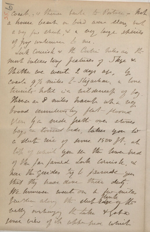 Lock[sic] Arnish & the Coolin[sic] [Cuillin] hills are the most interesting features of Skye & thither we went 2 days ago, by crack 9½ miles to Sligachan, a lone tourist hotel in a wilderness of bog. Thence an 8 miles march up a very broad uninteresting flat mound[?] glen by a rude path over stones, bogs & torrent beds, takes you to a steep rise of some 1500 ft at top of which you see the lower end of the far famed Loch Arnish & here the guides try to persuade you that they have done their duty. We however went on a few miles further along the stub[?] flank edge of the valley overhanging the Lake & got a good view of its upper end which
