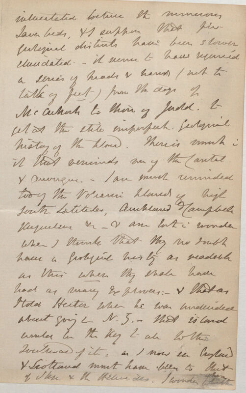 intercalated between the numerous Lava beds, & I suppose that few geological districts have been slower elucidated -- it seems to have required a series of heads & hands (not to talk of feet) from the days of McCullock to those of Judd, to get at the still imperfect geological history of the Island. There is much in it that reminds me of the Cantal & Auvergne -- I am much reminded too of the Volcanic Islands of high South Latitudes, Auckland & Campbell, Kerguelan[sic] [Kerguelen Island] etc -- I am lost in wonder when I think that they no doubt have a geological history as readable as this when they shall have had as many Explorers:-- & that as I told Hector*1a when he was undecided about going to N[ew] Z[ealand] -- that island would be the key to all to the Southward of it, as I now see England & Scotland must have been to that of Skye & the Hebrides. I wonder whether when