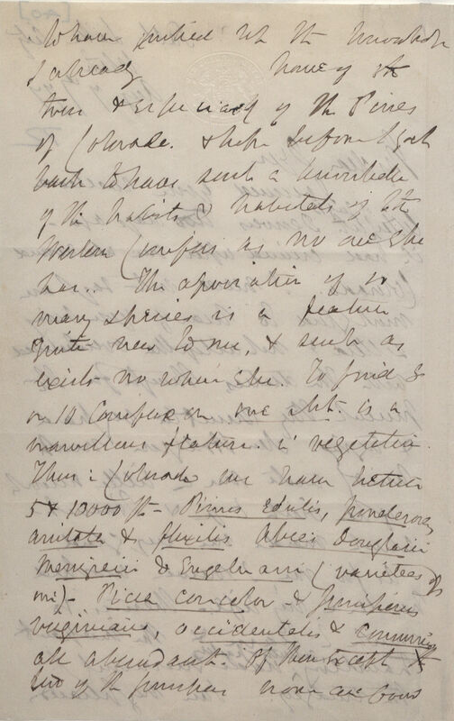 to have picked up the knowledge I already have of the trees & especially of the Pines of Colorado & hope before I get back to have such a knowledge of the habits & habitats of the Western Conifers as no one else has. The association of so many species is a feature quite new to me, & such as exists no where else. To find 8 or 10 Conifers on one M[oun]t[ain]. is a marvellous feature in vegetation. Thus in Colorado we have between 5 & 10000 f[ee]t Pinus edulis, ponderosa, aristata & flexilis Abies Douglasii Menziesii & Engelmannii (varieties of one) -- Picea concolor & Juniperus virginiana, occidentalis & communis, all abundant. Of these except the two of the Junipers none are found