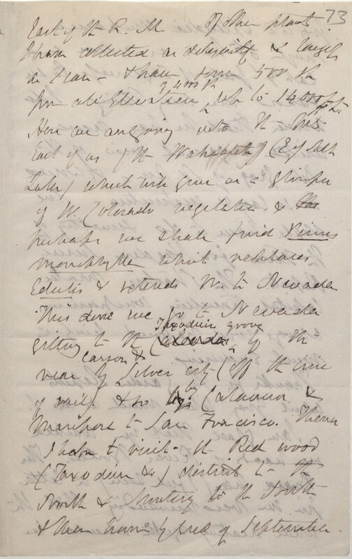 East of the R[ocky]. M[ountains]. Of other plants I have collected as diligently & largely as I can -- & have some 500 sp from all Elevations of 4000 f[ee]t up to 14000 f[ee]t. Here we are going into the M[oun]t[ain]s East of us (the Wahasatch [Wasatch]) (E[ast] of Salt Lake) which will give us a glimpse of W[est]. Colorado vegetation & the perhaps we shall find Pinus monophylla which replaces Edulis & extends W[est]. to Nevada. This done we go to Nevada getting to the Calendar Taxodium grove by the rear by Carson & Silver city (off the line of rail). & so by by Calavera & Mariposa to San Francisco. There I hope to visit the Red wood (Taxodium &c) district to the North & Monterey to the South & then home by end of September.
