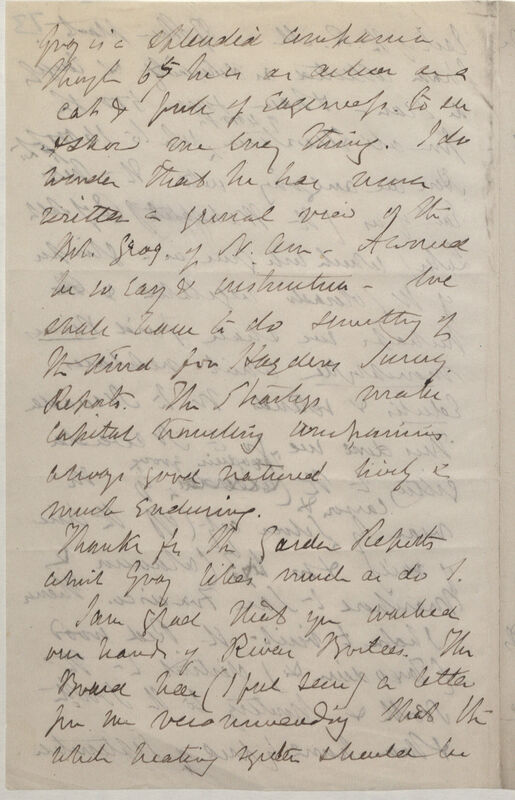 [Asa] Gray is a splendid companion though 65 he is as active as a cat & full of eagerness to see & show me every thing. I do wonder that he has never written a general view of the Bot[anical]. Geog[raphy]. of N[orth]. Am[erica]. -- it would be so easy & instructive -- We shall have to do something of the kind for Haydens Survey Reports. The Stracheys make capital travelling companions always good natured lively & much enduring.