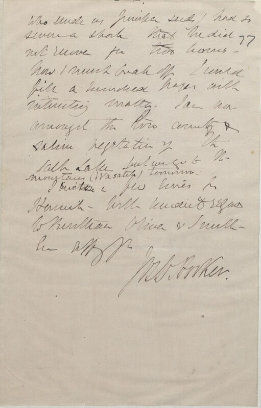 who sends us Juniper seeds) had so severe a shock that he did not recover for two hours -- now I must break off I could fill a hundred pages with interesting matter. I am now amongst the low country & native vegetation of the Salt Lake but we go to the mountains (Wasatch) tomorrow.