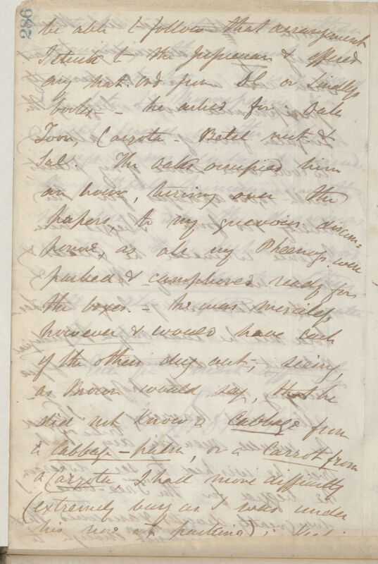 be able to follow that arrangement I stuck to the Jussieuan & offered any nat[ural] ord[er] from DC. [De Candolle] or Lindleys books, he asked for Oaks, Toon, Caryota, Betel nut & Sal. The oaks occupied him an hour, turning over the papers, to my grievous discomposure, as all my Phaenog[ram]s were packed & camphored ready for the boxes. He was merciless however & would have each of the others dug out, seeing, as Brown would say, that he did not know a cabbage from a cabbage--palm, or a carrot from a Caryota. I had more difficulty (extremely busy as I was under his nose at packing) in keeping