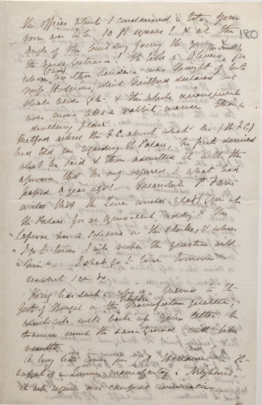 Mitford asked the F[rist]. C[ommissioner of Works]. about what he (the F.C.) had told me regarding the Palace, he first denied what he said & then admitted it with the assurance that he only referred to what had passed a year ago! Meanwhile P. Fane writes that the Queen would gladly give up the Palace for an equivalent, adding 'Mr Leferne has a scheme on the stocks[?], & when I go to town I will reopen the question with him' -- I shall go to town tomorrow & see what I can do.