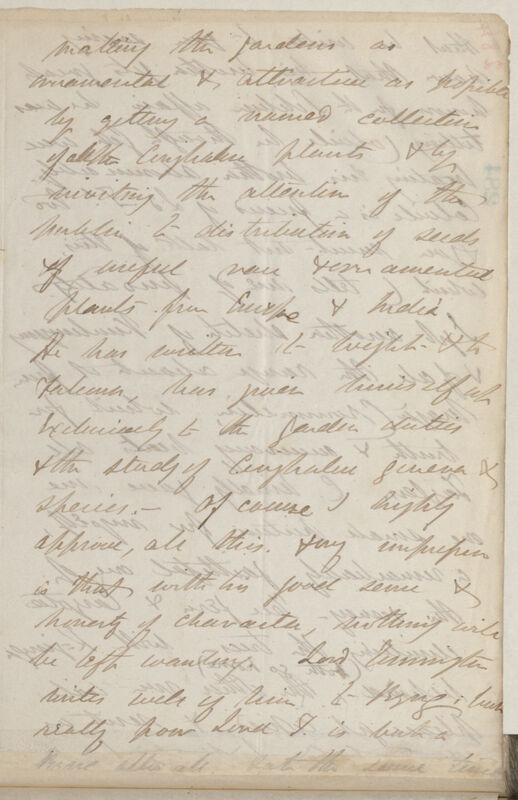 making the gardens as ornamental & attractive as possible by getting a named collection of all the Cinghalese plants & by inviting the attention of the public to distribution of seeds of useful[,] rare & ornamental plants from Europe & India. He has written to Wight & to Falconer, has given himself up exclusively to the garden duties & the study of Cinghalese genera & species. Of course I highly approve all this & my impression is that with his good sense & honesty of character, nothing will be left wanting. Lord Torrington writes well of him to Byng; but really poor Lord T[orrington]. is but a base[?] alter all. At the same time