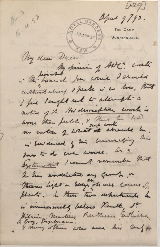 The "Lois" [Lois de la Nomenclature Botanique] will require careful handling. But why should you undertake so laborious a task? Would not Hemsley*13 be quite enough? A[lphonse] De Candolle's is the case of a man who deservedly fills a large space in the Botany of the middle & later part of the Century, but whose deeds it is singularly difficult to appraise satisfactorily, without appearing to depreciate them. He had great learning begot of leisure & wealth.