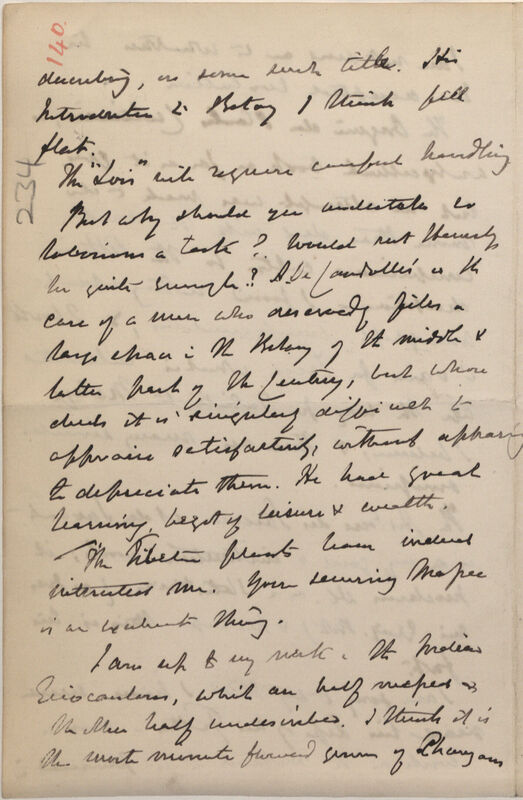 Of course the work was published before the Darwinian Epoch. Darwin*12 had the highest opinion of it. A[sa] Gray had I think a more modified one, but still high. I regarded some parts as first class, some as foolishness.