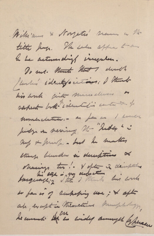 Do not think that I doubt Clarkes' identification; I think his work quite marvellous as respects both identification & nomenclature, -- as far as I could judge in reviewing the "index" in mss & proof, -- but he makes strange blunders in descriptions & drawings too! & often in descriptive language his style is very defective [.] Still I think his work so far is of surpassing use; & after all, except in theoretical morphology, he cannot ere err too wildly amongst Cyperaceae[?]