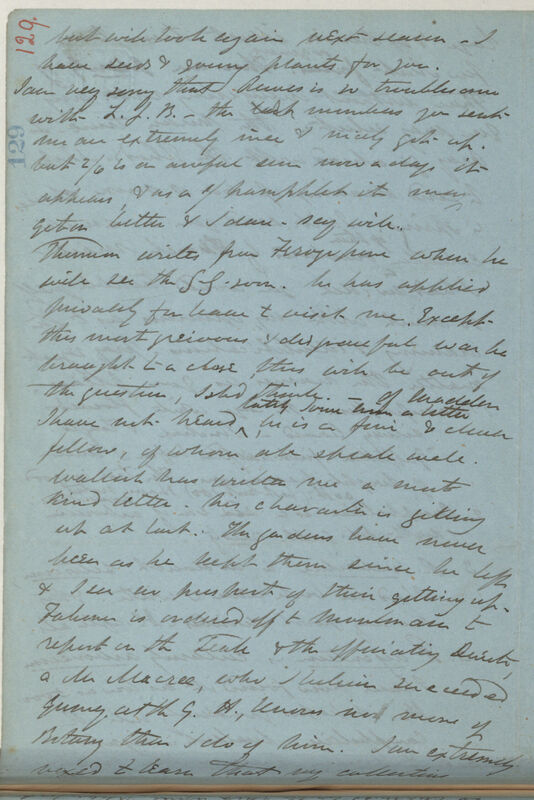 Thomson writes from Ferozepore [Firozpur] where he will see the G[overnor] G[eneral] soon, he has applied previously for leave to visit me. Except this most grievous & disgraceful war be brought to a close, this will be out of the question, I sh[oul]d think. -- of Madden I have not heard lately I owe him a letter, he is a fine & clever fellow, of whom all speak well. Wallich has written me a most kind letter, his character is getting up at last. The gardens have never been as he kept them since he left & I see no prospect of their getting up. Falconer is ordered off to Moulmain [Mawlamyine] to report on the Teak & the operating Director a Mr Macrae, who I believe succeeded Gurney at the G. H., knows no more of Botany than I do of him. I am extremely vexed to learn that my collections