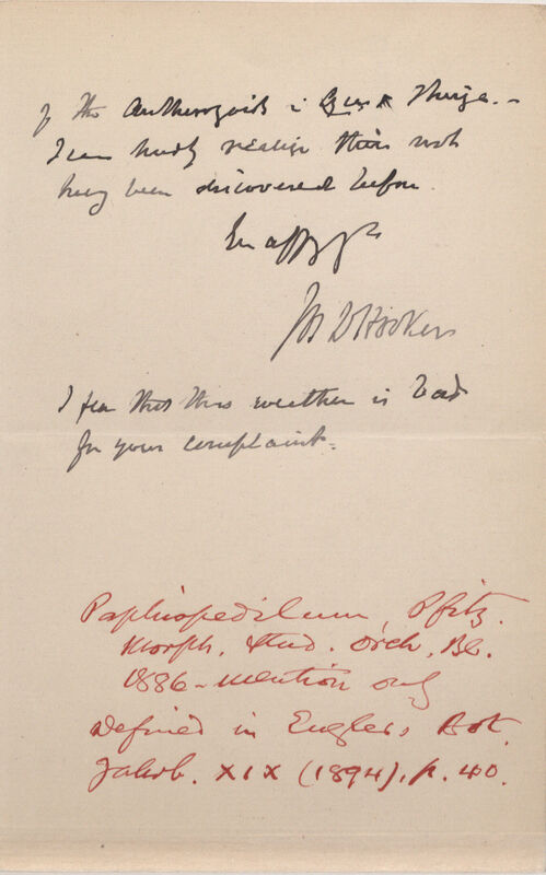 As I cannot get to Kew during this weather with prudence, & you may be in doubt about Cypripedia, I write to say what I think may prove to be the case : - which is that the genus you name as having been given to the Indian Cypripedia is perhaps founded on the character of their coriaceous leaves, as compared with the plicate membranous leaved species. If this character is accepted as of generic value (alone) it will indicate the breaking up of a