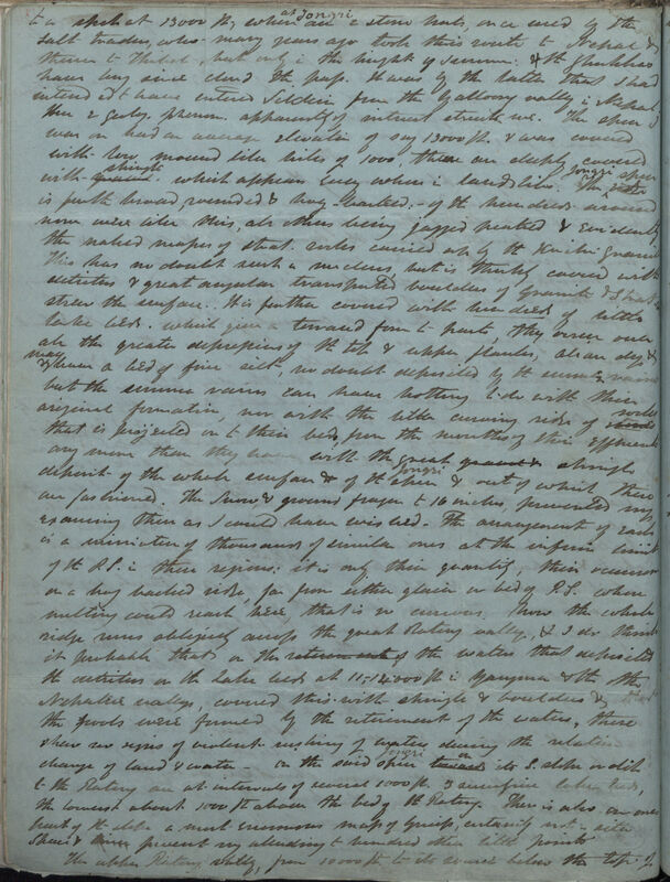 to a spot at 13000 ft, where at Jongri are 2 stone huts, once used by the Salt traders, who many years ago took this route to Nepal & thence to Thibet [Tibet], but only in the height of summer: the Gherkhas [Gurkhas] have long since closed the pass. It was by the latter that I had intended to have entered Sikkim from the Yalloong valley in Nepal. Here 2 geolog[ical]. phenom[enon]. apparently of interest struck me. The spur I was on had an average elevation of say 13000 ft. & was covered with low mound like hills of 1000, these are deeply covered with gravel shingle, which appears every where in landslips. The Jongri spur ridge is further broad, rounded & hog--backed:--of the hundreds around none were like this, all others being jagged peaked & evidently the naked masses of strat. rocks carried up by the Kinchin granite. This has no doubt such a nucleus, but is thickly covered with detritus & great angular transported boulders of Granite & Strat. Rocks strew the surface.. It is further covered with hundreds of little lake beds, which give a terraced form to parts, they occur over all the greater depressions of the top & upper flanks, all are dry & many have a bed of fine silt, no doubt deposited by the summer rains, but the summer rains can have nothing to do with their original formation, nor with the little curving ridge of stones rocks that is projected on to their beds, from the mouths of their effluents any more than they have with the great shingle deposit of the whole surface of the Jongri spur & out of which these are fashioned. The Snow, & ground frozen to 16 inches, prevented my examining them as I could have wished. -- The arrangement of each is a miniature of thousands of similar ones at the inferior limit of the P[erpetual].S[now]. in these regions; it is only their quantity, their occurrence on a hog backed ridge, far from either glacier or bed of P[erpetual].S[now]. whose melting could reach here, that is so curious. Now the whole ridge runs obliquely across the great Ratong valley, & I do think it probable that the retirement of waters that deposited the detritus on the Lake beds at 11,--14000 ft in Yangma & the other Nepalese valleys, covered this with shingle & boulders & that the pools were formed by the retirement of the waters, these shew[sic] no signs of violent rushing of waters during the relative change of land & water -- On the said Jongri spur towards on its S[outh]. slope or dip to the Ratong are at intervals of several 1000 ft. 3 successive lake beds, the lowest about 1000 ft above the bed of the Ratong. There is also on one part of the slope a most enormous mass of Gneiss, certainly not in situ. Space & time prevent my alluding to hundred other little points.