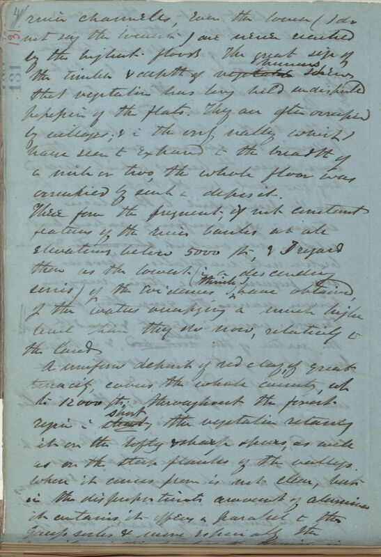 river channels, even the lower (I do not say the lowest) are never reached by the highest floods The great size of the timber & depth of vegetable humus shews[sic] that vegetation has long held undisputed possession of the flats. They are often occupied by villages; & in the only valley which I have seen to expand to the breadth of a mile or two, the whole floor was occupied by such a deposit.