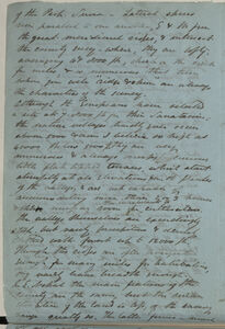 to a spot at 13000 ft, where at Jongri are 2 stone huts, once used by the Salt traders, who many years ago took this route to Nepal & thence to Thibet [Tibet], but only in the height of summer: the Gherkhas [Gurkhas] have long since closed the pass. It was by the latter that I had intended to have entered Sikkim from the Yalloong valley in Nepal. Here 2 geolog[ical]. phenom[enon]. apparently of interest struck me. The spur I was on had an average elevation of say 13000 ft. & was covered with low mound like hills of 1000, these are deeply covered with gravel shingle, which appears every where in landslips. The Jongri spur ridge is further broad, rounded & hog--backed:--of the hundreds around none were like this, all others being jagged peaked & evidently the naked masses of strat. rocks carried up by the Kinchin granite. This has no doubt such a nucleus, but is thickly covered with detritus & great angular transported boulders of Granite & Strat. Rocks strew the surface.. It is further covered with hundreds of little lake beds, which give a terraced form to parts, they occur over all the greater depressions of the top & upper flanks, all are dry & many have a bed of fine silt, no doubt deposited by the summer rains, but the summer rains can have nothing to do with their original formation, nor with the little curving ridge of stones rocks that is projected on to their beds, from the mouths of their effluents any more than they have with the great shingle deposit of the whole surface of the Jongri spur & out of which these are fashioned. The Snow, & ground frozen to 16 inches, prevented my examining them as I could have wished. -- The arrangement of each is a miniature of thousands of similar ones at the inferior limit of the P[erpetual].S[now]. in these regions; it is only their quantity, their occurrence on a hog backed ridge, far from either glacier or bed of P[erpetual].S[now]. whose melting could reach here, that is so curious. Now the whole ridge runs obliquely across the great Ratong valley, & I do think it probable that the retirement of waters that deposited the detritus on the Lake beds at 11,--14000 ft in Yangma & the other Nepalese valleys, covered this with shingle & boulders & that the pools were formed by the retirement of the waters, these shew[sic] no signs of violent rushing of waters during the relative change of land & water -- On the said Jongri spur towards on its S[outh]. slope or dip to the Ratong are at intervals of several 1000 ft. 3 successive lake beds, the lowest about 1000 ft above the bed of the Ratong. There is also on one part of the slope a most enormous mass of Gneiss, certainly not in situ. Space & time prevent my alluding to hundred other little points.