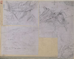 From this position we had a superb view of the Snowy range & my first insight into the structure of elevations above 16000 ft. for a grand peak, of about 20000 ft., presented a cliff of white Plutonic rocks capped with a red & black mass of baked & distorted stratified do. [A diagram appears here, a sketch of the mountains labelled ] "Strat" "Granitic" and "P[erpetual] Snow"]. The weather was fortunately splendid & not being able to stir from the spot from deep snow & jungle I had a fine opport[unity]. for observing drawing & watching the varied & beautiful phenomena of the atmosphere, as they succeeded[sic] one another from one sunrise to the next, for the prospect included the whole of Sikkim from the Bhotan [Bhutan] Snows to the Nipal [Nepal] frontier & from the Snowy Mts to the plains & its winding rivers. Having had comparative observations taken for me throughout my journeyings by an invaluable friend at Darjeeling I hope these too will be of value. -- Thence we descended to the G[rea]t. Rungeet, & visited the oldest convents of Sikkim, all Buddhist--& wonderfully beautiful as to internal decorations-- these we measured drew & described, they are eminently curious, purely Buddhistical, without a trace of Hindoo [Hindu] worship. Another day took us to the Pemiongchi convents, also very remarkable for their size antiquity & paintings-- Here Campbell left me for Darjeeling & I proceeded to the Snows, with a party of about 25. -- The last village (Yoksun) is at as low an elevation as 5000 ft & the most remarkable in site of any I have seen in Sikkim: it occupies too much the greatest extent of flat ground, though buried amongst the loftiest spurs I am sure it is a glacial deposit, & had I time to send you a birds eye view of its features & position relatively to a curving spur against which it abuts & whose hollow is opposite the (Ratong) valley, of the greatest river which descends from the P[erpetual].S[now]. of Kinchin, you would I think say so too. I am now more than ever alive to the fact, that any flat is in Sikkim was ought to be an object of suspicion to the Geologist: & that for one that has resisted the 8 annual months rains of this region, there must be hundreds washed away. We ascended the Ratong valley slowly & with a good deal of labor for 3 days, reaching on the third march snow at 8000 ft--hence up through the forest to beyond its limits at 11000 ft--where we emerged on a lofty long spur from the shoulder of the Gr[ea]t. Mt. The Perp[etual]. Snow on all sides at 14000, the great top N[orth], about 8' off, & the two main shoulders one on each side with Peaks of 22 & 25000 on either hand. The Ratong between wound up to the granite cliffs of the central mass, flanked by the lofty precipices of which I send you a pencil outline above (as seen from 20 miles further off.) We floundered along through Snow & dwarf Rhododendrons