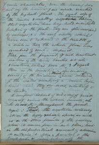 narrower belt, & it further trends a little to the N[orth]. W[est]., so that there is full 80 or 90 miles of SubHimal. between the Plains of India & Perp[etual]. Snow in E[ast]. Nepal & but only 60 in Sikkim -- Hence a tropical vegetation advances good 20 miles further north in Nepal -- in both cases following the sinuous course of the larger rivers, the beds of which descend very suddenly from the Perp[etual]. snows to 5000 ft. from which to the plains the stream is of a uniformly rapid, but seldom very violent, character & never broken into waterfalls. Terraces are very frequent along their margins; however narrow the gorge they flow through; varying in length & breadth with the nature of the river bed valley, & in height from 10 to 60 feet: or even 100 ft. These are formed of sand gravel & enormous water--worn masses of rock, their banks are precipitous, their tops, where cleared, seen to be covered with great blocks of stone: & where not, always supporting a rank jungle, with enormous trees. These are evidently the deposit of an incomparably greater body of water than ever now flows along the