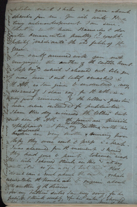 I am vastly amused with your not recognizing the author of the cattle hunt in Ross Voy[age] I was petted with Ross about the way he was humbugging the [part of mss. missing, 2 words illeg.] contribution & would not give my name *2 which I should not tell you of now, were I not lately smashed in the Ath[enaeum]., as I am given to understand: very deservedly I dare say; for the ath[enaeum]. is a very good reviewer & the letters in question were never intended for publication. I have this day received the "letters" but not seen the Ath[enaeum]. the former are puerile & flippant. I fear between my Father with his broken dislocated arm & my Mother nursing poor Bessy they were sent to press in a heap. I was alarmed from the moment I heard they had gone to print. Whoever reads them will I should think see this & at any rate it is so "far a cry to Loch Awe" that I do not care a rush about the matter, & shall never take the trouble to enquire about the author of the Review.