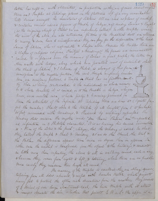the latter has crept in, with obscenities, in proportion as they are of more recent origin. There are 3 Temples at Tassiding, placed on the flattened top of a very remarkable hill buried amongst the mountains of Sikkim. All are used as places of worship, & contain various adored figures of Budh, of Sakya, & of sundry Lamas & Rajahs (as the reigning chiefs of Thibet &c are improperly called). In other temples, women, the wives of the above are also introduced, for some of the Buddhist sects are allowed to marry, & even have 2 wives: provided they can pay for the dispensation to the head Lama of Sikkim, who is responsible to Lhassa alone. Besides the temples there are 2 classes of religious edifices, Chaityas & Mendengs: the former are monuments raised to or placed over the remains of Lamas or great people; the latter long stone walls with ledges, along which run parallel rows of inscribed slabs. The Chait of Sikkim, & I believe of Thibet is always of this form; [a sketch of Chaitya appears here to the right of the text] the hemisphere is the mystic portion, the rest, though uniformly similar here are accessory portions. A Temple or Chait has no further sanctity than as being consecrated to the individual in whose memory or to whose sanctity it is raised, or to the Buddh or Sakya, who, you know, were mortal men, whose piety & learning procured for them the attributes of the Infinite. At Tassiding there are some 50 (I quite forget the number) Chaits close to the temple, of all heights, from 6 to perhaps 60 feet, surrounded with mendengs, & Shadowed by weeping cypresses. The Mendeng slabs contain the mystic words “Am mani Pudini am”? repeated ad infinitum in 3 Thibetan characters. It is as bearing this sacred invocation to “Him of the Lotus & the Jewel”, (Sakya), that the mendeng is adored. In short, they hallow the Temple & Chait & mendeng, as we do the church, the tomb, & the Bible -- the difference appears to me more in degree than in essences. In either case the worship is transferred from the object to the building , & consists in little more than repeating the above to all, in walking round, each or any whenever they occur from right or left, & kotowing where there are no puddles. More rarely they measure their length all round.