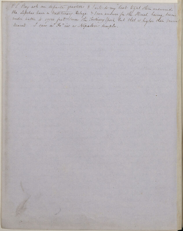 P.S. Pray ask me definite questions & I will do my best to get the answered. The Lepchas have a traditionary Deluge. & I can answer for the Himal. having been under water to 17,000 feet since the tertiary Epoch, but that is higher than mount Arafat. I saw a "Fo" In a Nepalese temple.