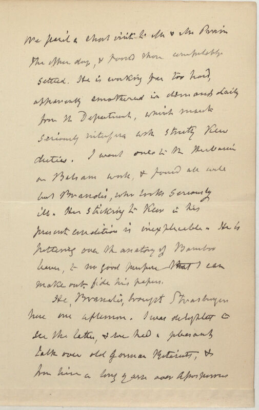 We paid a short visit to Mr & Mrs Prain*4 the other day, & found them completely settled. He is working far too hard, apparently smothered in demands daily from the Department [of Agriculture & Fisheries?], which must seriously interfere with strictly Kew duties. I went over to the Herbarium on Balsam work, & found all well but Brandis*5, who looks seriously ill. His sticking to Kew in his present constitution is inexplicable. He is pottering over the anatomy of Bamboo leaves, to no good purpose that I can make out, fide his papers.