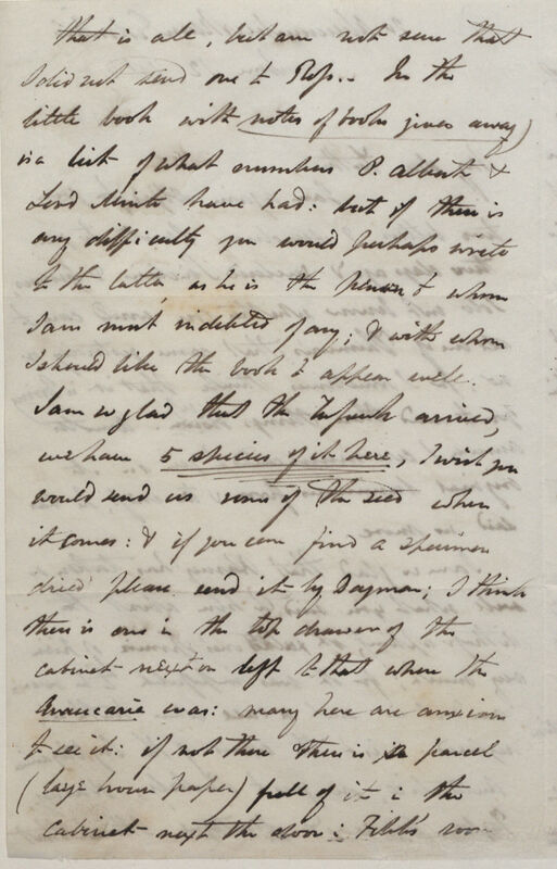 I am so glad that the Tussack[?]*13a arrived, we have 5 specimens of it here, I wish you could send us some of the seed when it arrives: & if you can find a specimen dried please send it by Dayman*14; I think there is one in the top drawer of the cabinet next or left to that where the Araucaria*15 was: many here are anxious to see it: if not there [are] others in the parcel (large brown paper) full[?] of it in the cabinet nex[t] to the door in Fitch's*16 room
