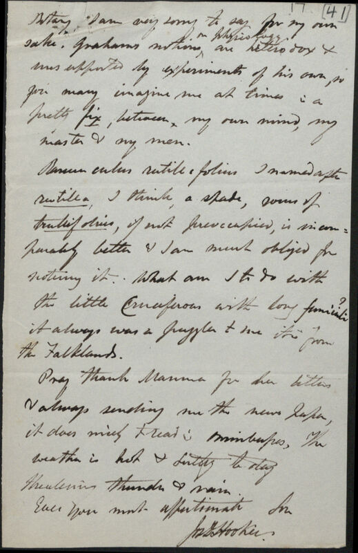 It is from want of books that I cannot get on with the cont. Introd[uction] to Ant[arctic] Flora; as well as the pressure of other things, I will not say what when going out seems so necessary here & Graham*31 says I must go out dining. I will however try to do something: but it is no joke having to write up Respiration, circulation, Irritability, Life & such vegetable wonders, which the students here so delight in I must say far more than in terminology or Systematic