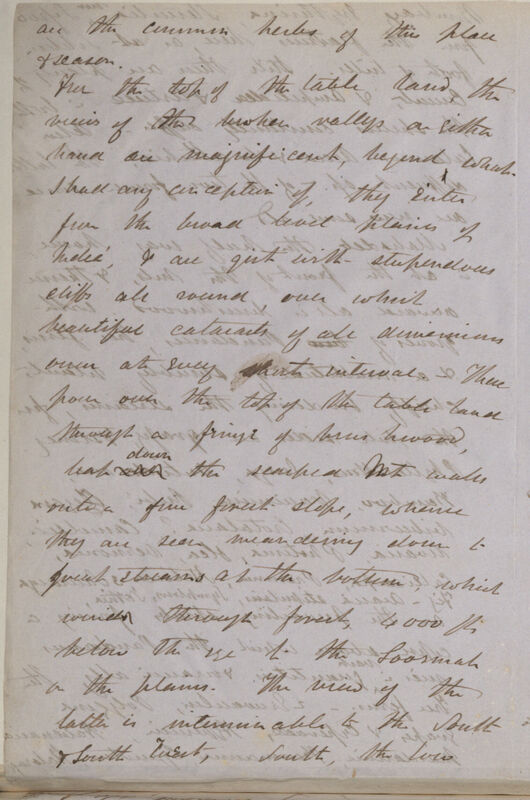 From the top of the table land, the views of the broken valleys on either hand are magnificent, beyond what I had any conception of, they enter from the broad level plains of India, & are girt with stupendous cliffs all round, over which beautiful cataracts of all dimensions occur at every short interval. These pour over the top of the table land through a fringe of brushwood, leap over down the scarped Mt walls onto a fine forest slope, whence they are seen meandering down to great streams at the bottom, which wind through forest, 4000 ft below the eye to the Soormah on the plains. The view of the latter is interminable to the South & South West, South, the low