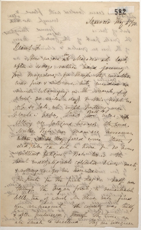 Here we are at in Marocco at last, after a 4 days rather hard journey from Mogadore*3; for though the weather was fine & not over--hot, we did so much botanizing on the march (of about 30 miles a day) & this kept us up so late at night putting our plants in paper, that we Ball*4 & I were all getting very fatigued towards the end. Neither Ball nor Maw*5 are horseman either, [word crossed out, illeg.] & so they fared worse than I did, who can sit a horse for 10 hours without fatigue. Ball too is the most indefatigable collector I ever met, & nothing escapes his keen eye.