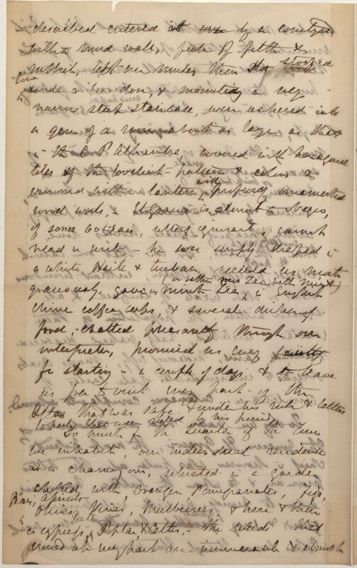 So much for the Quarter of the Town we inhabit, our individual residence is a charming one, situated in a garden choked with Oranges, Pomegranates, Figs, Pear, Apricots Olives[,] Vines, Mulberries, & here & there is cypress Date Poplar, & Celtis, -- the weeds that wind up every part are immeasurable & almost