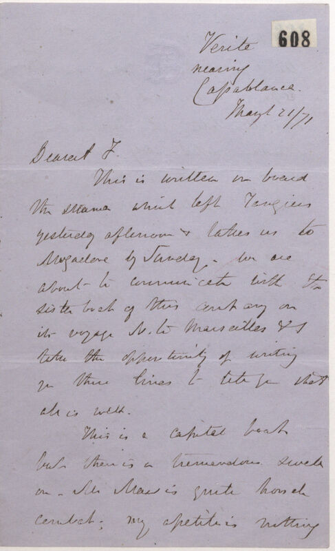 This is written on board the steamer which left Tangiers yesterday afternoon & takes us to Mogadore [Essaouira] by Sunday. We are about to communicate with the sister boat of this contrary[?] on its voyage N. to Marseilles & I take the opportunity of writing you these lines to tell you that all is well.