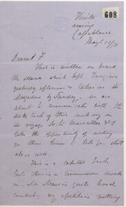 JDH informs his wife Frances Hooker, that he is on a steamer from Tangiers to Mogadore [Essaouira] & will send this letter by means of a passing vessel going in the opposite direction to Marseille. The boat they are on is good one but the sea is rough & he & his companion [George] Maw are suffering with sea sickness & lack of appetite but [John] Ball is unaffected. JDH send his regards to all at Pendock, & expresses an intention to write to the 'President of the Wanderers' there [Reverend William Samuel Symonds] if he can remember how to spell his surname. They lay off the coast near Rabat earlier in the day but were unable to communicate with the town. There is a Frenchman on board trying to cure his sea sickness by holding lemon-halves on his temples. Sir. J. Hay has informed them that everything is ready for their trip but JDH is anxious to get to Mogadore & make plans, he thinks the trip may take longer than previously predicted. Mr White the consul at Tangier was a pupil of JDH's Uncle, Reverend William Jacobson, at Oxford University & send his regards along with the gift of cup made from Fez earthenware. JDH has met with a Mr Cardwell, a nephew of the War Minister [Edward Cardwell], who is travelling aimlessly. JDH gives some instruction for Mr [John] Smith regarding care of bulbs. [Edward] Crump is a good man, also currently sea sick.