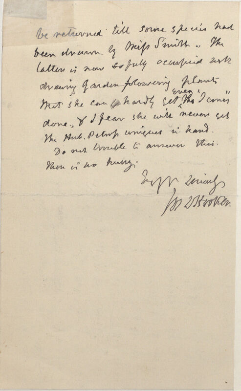 be returned till some species had been drawn by Miss Smith.*6 The latter is now so fully occupied with drawing garden flowering plants that she can hardly get even the "Icones" done, & I fear she will never get the Herb[arium] Petrog[?] uniques in hand.