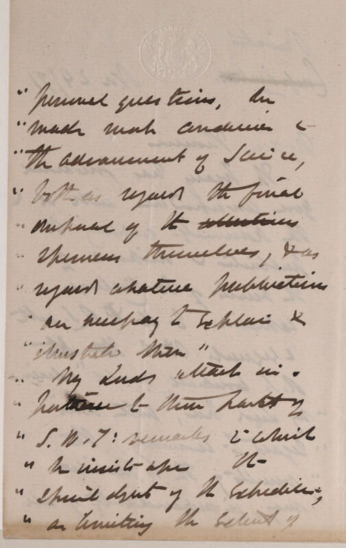 The Treasury has forwarded your correspondence with it & the Admiralty -- respecting its publication & dispersal of the results of the Challenger Expedition to the P.R.S. [President of the Royal Society]*2 with a request that the ? the? R.S. Council would "advise my Lords how, with due regard to honesty, the results of the expedition may, independently of all