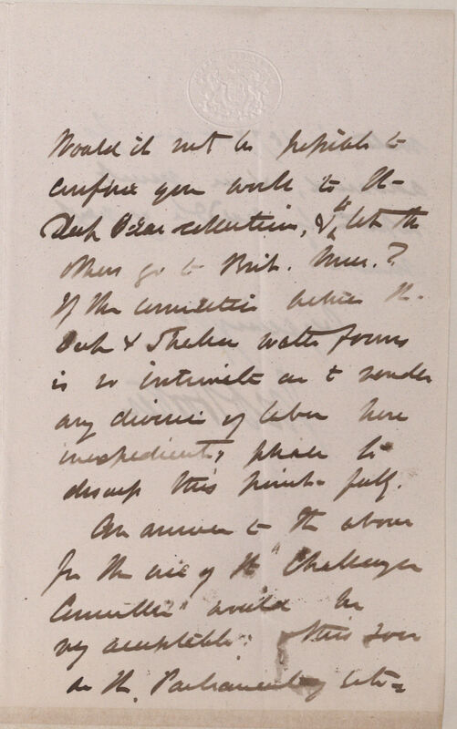 The Treasury has forwarded your correspondence with it & the Admiralty -- respecting its publication & dispersal of the results of the Challenger Expedition to the P.R.S. [President of the Royal Society]*2 with a request that the ? the? R.S. Council would "advise my Lords how, with due regard to honesty, the results of the expedition may, independently of all