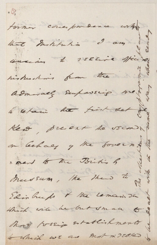 former correspondence with that Institution I am concerned to receive official instructions from the Admiralty empowering me to retain the first set at Kew, present the second on behalf of the government to the British Museum, the third to Edinburgh & the remainder which will be but small to those foreign establishments to which we are most indebted.