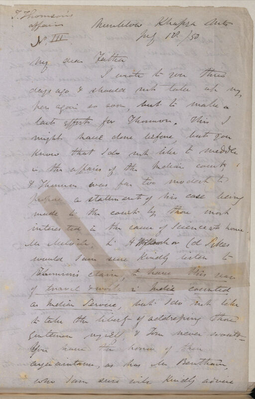 I wrote to you three days ago & should not take up my pen again so soon, but to make a last effort for [Thomas] Thomson. This I might have done before but you know that I do not like to meddle in the affairs of the Indian court & Thomson was far too modest to propose a statement of his case being made to the court by those most interested in the cause of science at tome. Mr Melvile, Sir H Willock or Col[onel] Sykes would I am sure kindly listen to Thomson's claim, to have this year of travel & work in India counted as Indian Service, but I do not like to take the liberty of addressing those gentlemen myself, & Tom never would. You have the honour of their acquaintance, as has Mr Bentham who I am sure will kindly advise