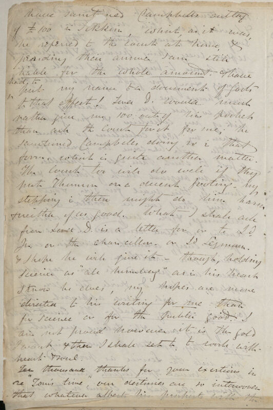 have sanctioned Campbells outlay of £100 in Sikkim, which as it was, he referred to the court at home, & pending their answer I am still liable for the whole amount, & have had to put my name to a document of Govts. to that effect ! Lord D[alhousie] would much rather give me 100 out of his pocket than ask the Court for it for me; he sanctioned C[ampbel]s doing so in that form, which is quite another matter. The Court too will do well if they put Thomson on a decent footing, my stepping in there might do him harm & neither of us good. What I shall ask from Lord D[alhousie] is a letter for or to Ld Jn